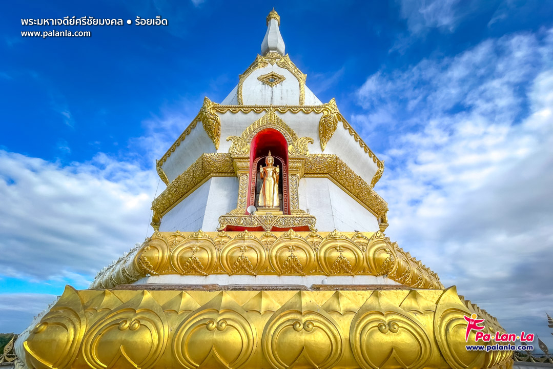 พระมหาเจดีย์ศรีชัยมงคลสร้างในเนื้อที่ 101 ไร่ กว้าง 101 เมตร ยาว 101 เมตร ความสูง 101 เมตร รวมยอดทองคำเป็น 109 เมตร ใช้ทองคำหนัก 4,750 บาท หรือประมาณ 60 กิโลกรัม รอบๆ พระมหาเจดีย์ศรีชัยมงคลนั้นรายล้อมด้วยเจดีย์องค์เล็กทั้ง 8 ทิศ สร้าง ภายในองค์พระมหาเจดีย์มีความงดงามราวกับดินแดนสวรรค์ แบ่งเป็นทั้งหมด 5 ชั้นด้วยกัน ได้แก่