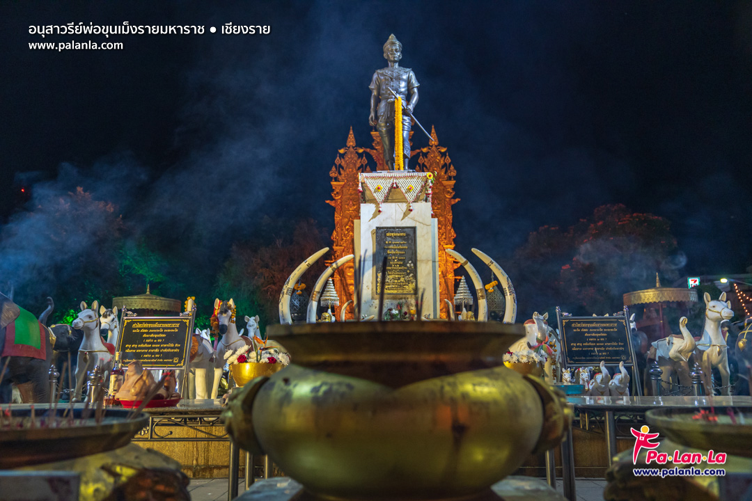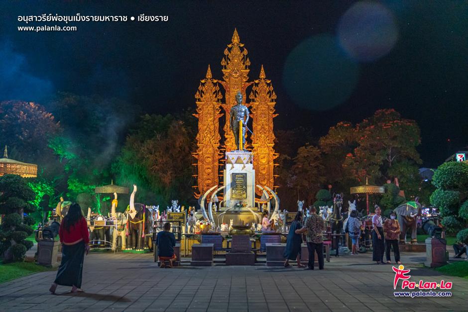 ประชาชนเดินทางมากราบไหว้สักการะอนุสาวรีย์พ่อขุนเม็งรายในยามค่ำคืน