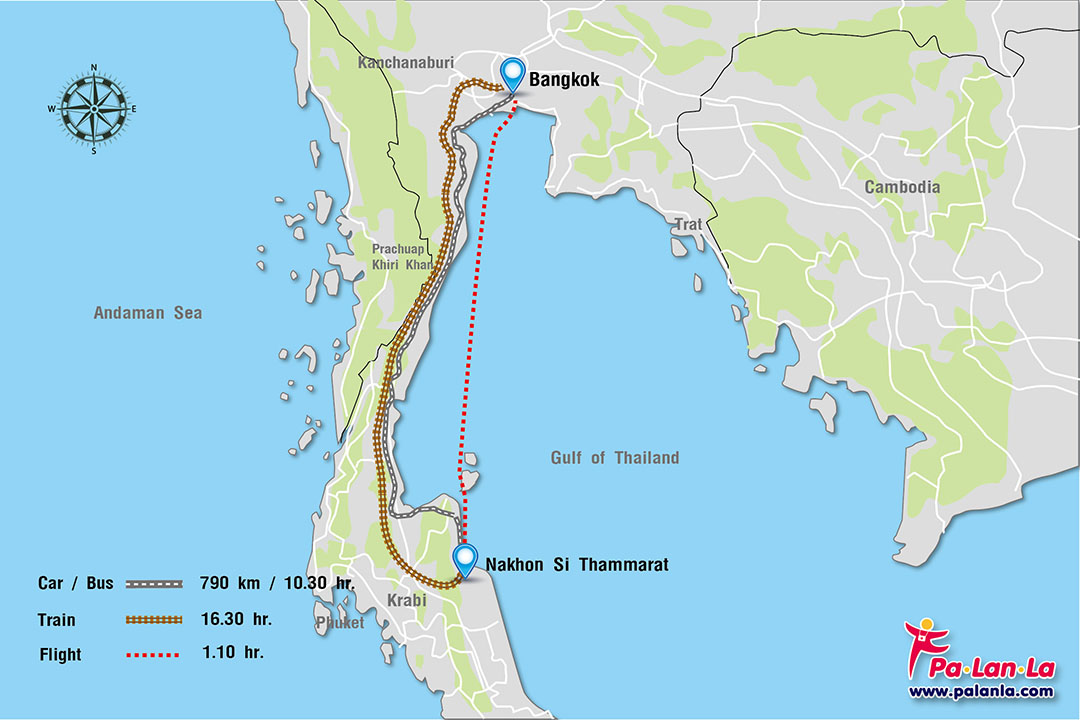 - เครื่องบิน (Flight) การเดินทางโดยเครื่องบินจากสนามบินดอนเมืองและสุวรรณภูมิ ไปสนามบินนครศรีธรรมราช ใช้เวลาเดินทางประมาณ 1 ชั่วโมง 10 นาที