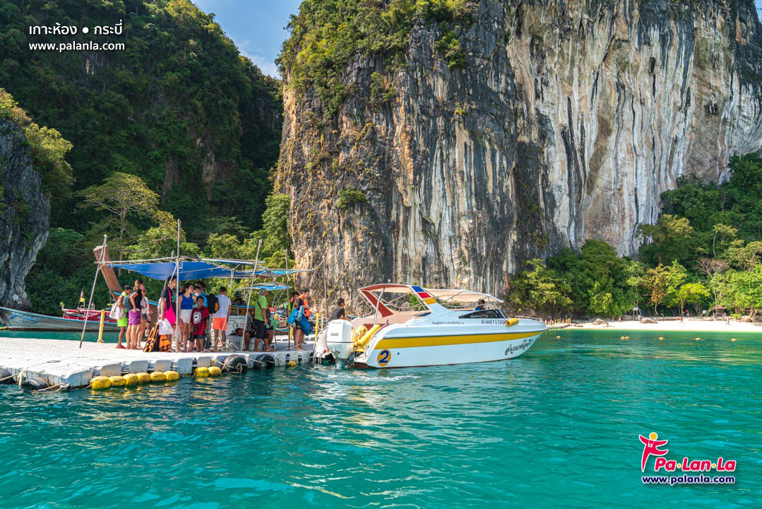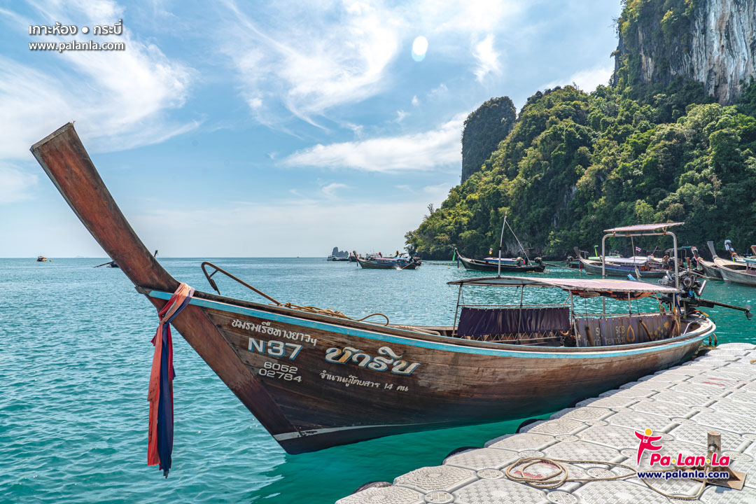 เรือหางยาวของชมรมเรือหางยาวอ่าวนาง ที่ให้บริการพานักท่องเที่ยวมายังเกาะห้อง