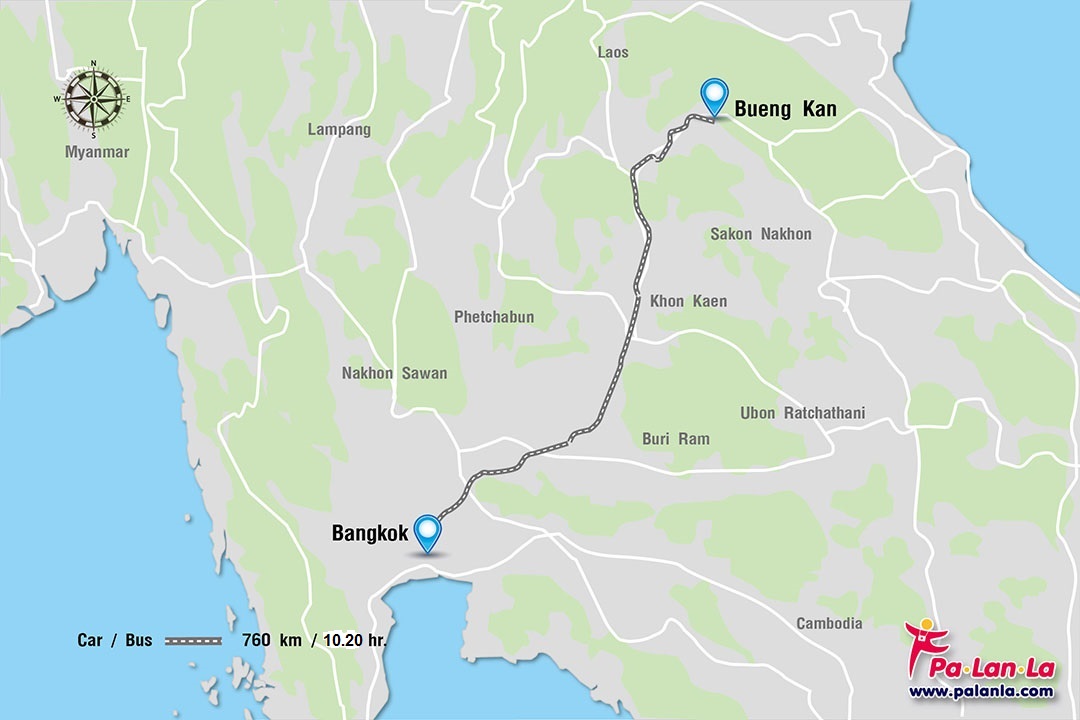 - รถยนต์ (Car/ Bus) การเดินทางโดยรถยนต์จากกรุงเทพฯ ไปจังหวัดบึงกาฬ มีระยะทาง 760 กิโลเมตร ใช้เวลาเดินทางประมาณ 10 ชั่วโมง 20 นาที