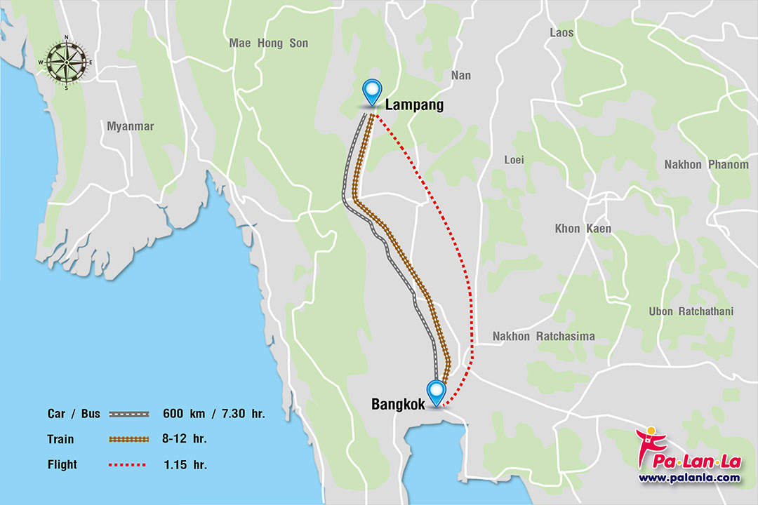 - เครื่องบิน (Flight) การเดินทางโดยเครื่องบินจากสนามบินดอนเมืองและสุวรรณภูมิ ไปสนามบินจังหวัดลำปางใช้เวลาเดินทางประมาณ 1 ชั่วโมง 15 นาที