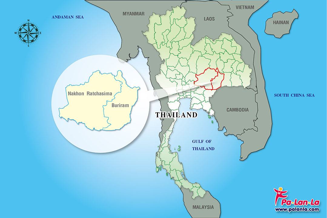 แผนที่ประเทศไทย แสดงตำแหน่งของจังหวัดบุรีรัมย์ และจังหวัดนครราชสีมา