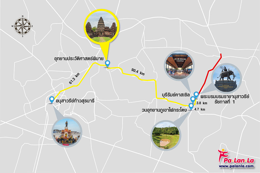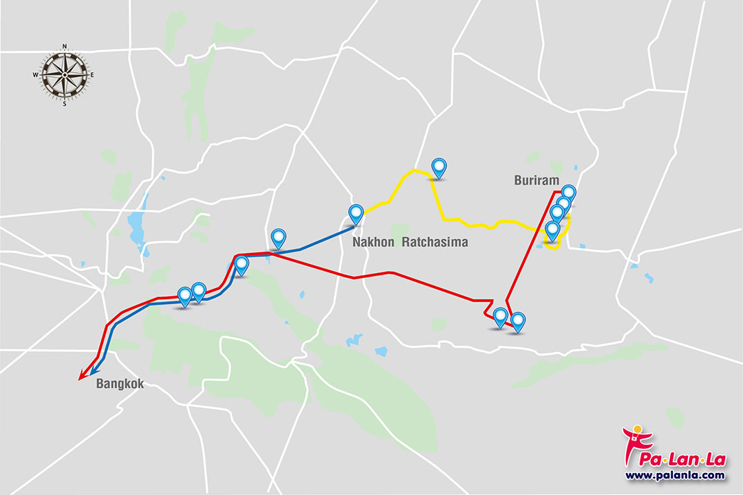 แผนที่แสดงตำแหน่งของสถานที่ท่องเที่ยวต่างๆ ทั้ง 3 วันในจังหวัดบุรีรัมย์และจังหวัดนครราชสีมา