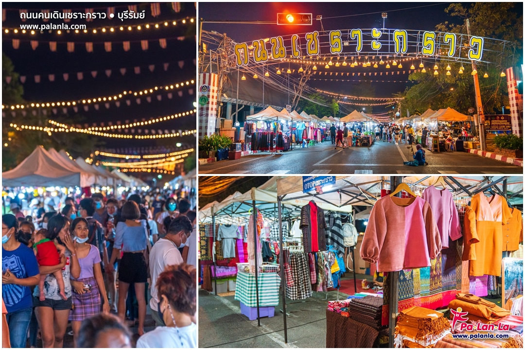 หลังจากแสงอาทิตย์ได้อำลาช่องประตูทั้ง 15 บานไปแล้ว เราก็เดินทางออกจากปราสาทพนมรุ้ง มุ่งหน้าเข้าสู่ตัวเมืองบุรีรัมย์ซึ่งจะเป็นที่พำนักของเราในค่ำคืนนี้ ด้วยระยะทาง 63 กิโลเมตรกว่าๆ พวกเราก็เดินทางมาถึงตัวจังหวัดบุรีรัมย์ สำหรับสถานที่ที่เหมาะแก่การเดินเล่น หาของอร่อยๆ รับประทานในคืนวันเสาร์เช่นนี้ ไม่น่าจะมีที่ใดที่เหมาะไปกว่าถนนคนเดินเซราะกราว ถนนคนเดินยอดฮิตใจกลางเมืองบุรีรัมย์ที่จัดขึ้นทุกๆ วันเสาร์และอาทิตย์