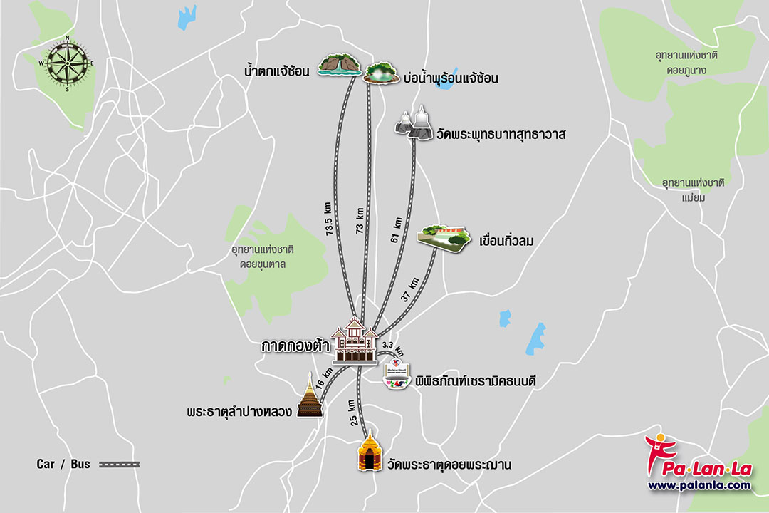 แผนที่แสดง 8 สถานที่ท่องเที่ยวยอดนิยมในจังหวัดลำปาง โดยมีกาดกองต้าเป็นศูนย์กลาง