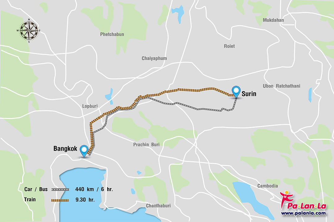 - รถยนต์ (Car/ Bus) การเดินทางโดยรถยนต์จากกรุงเทพฯ ไปจังหวัดสุรินทร์ มีระยะทาง 440 กิโลเมตร ใช้เวลาเดินทางประมาณ 6 ชั่วโมง
