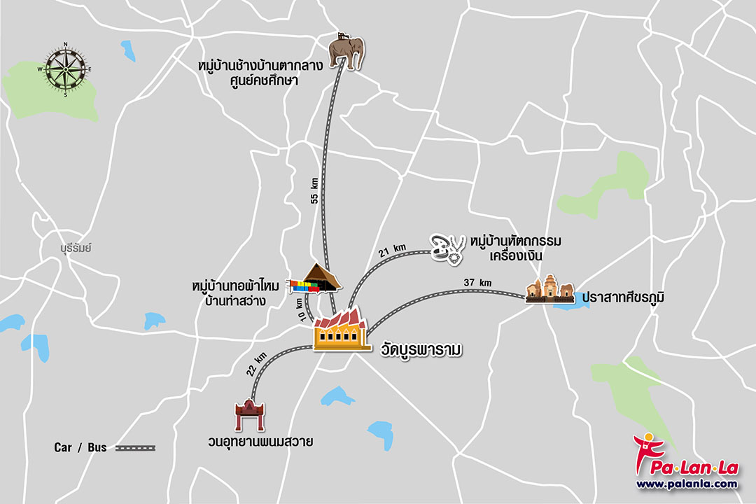 แผนที่แสดง 6 สถานที่ท่องเที่ยวยอดนิยมในจังหวัดสุรินทร์ โดยมีวัดบูรพารามเป็นศูนย์กลาง