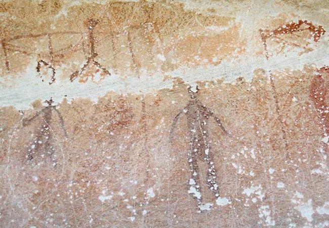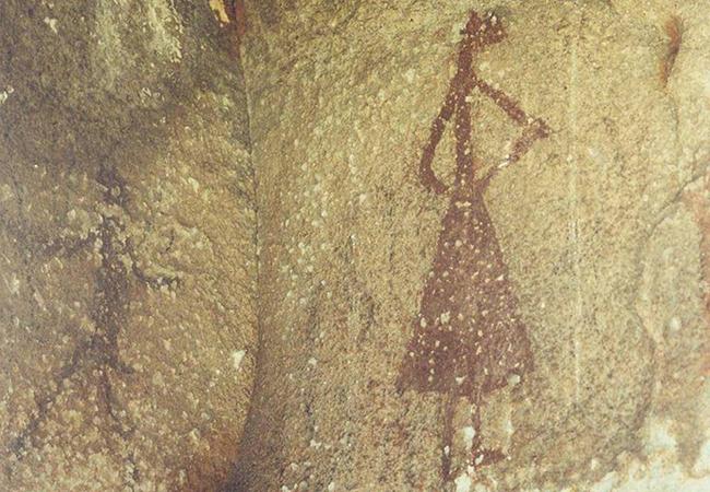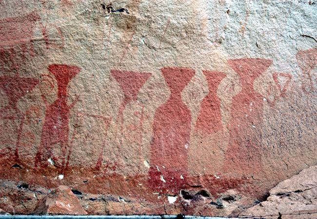 ภาพเขียนสีกลุ่มที่ 3 บริเวณผาหมอน ส่วนใหญ่เป็นภาพคนนุ่งกระโปรง (ขอขอบคุณภาพจาก http://portal.dnp.go.th/Content/nationalpark?contentId=3784)