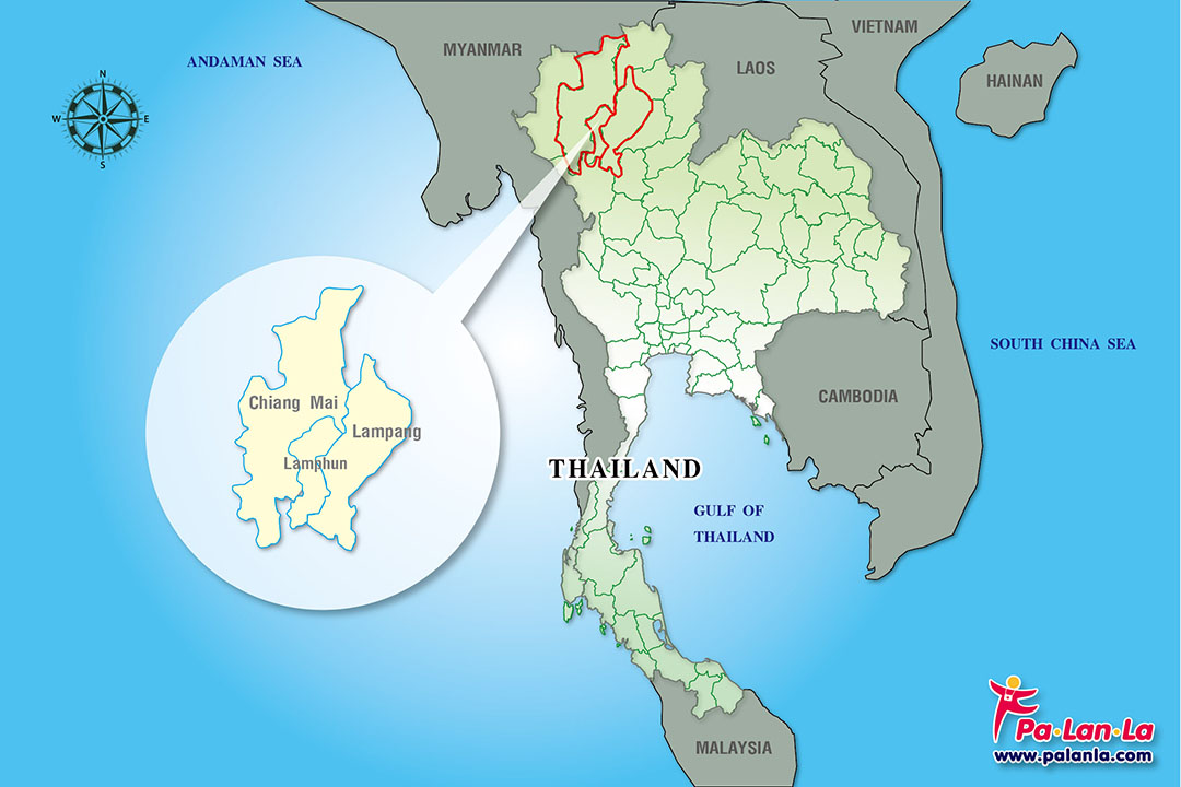 แผนที่ประเทศไทย แสดงตำแหน่งของจังหวัดเชียงใหม่ จังหวัดลำพูน และจังหวัดลำปาง