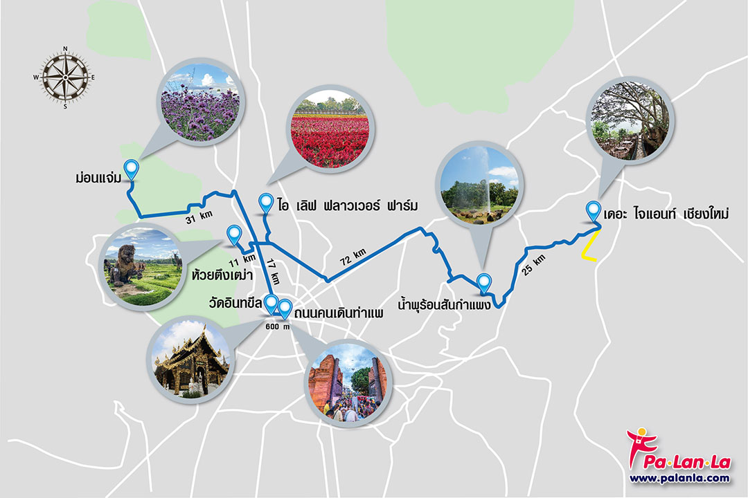 (เชียงใหม่ : The Giant Chiangmai - น้ำพุร้อนสันกำแพง - ม่อนแจ่ม - อ่างเก็บน้ำห้วยตึงเฒ่า - I Love Flower Farm - วัดอินทขีล - ถนนคนเดินท่าแพ)