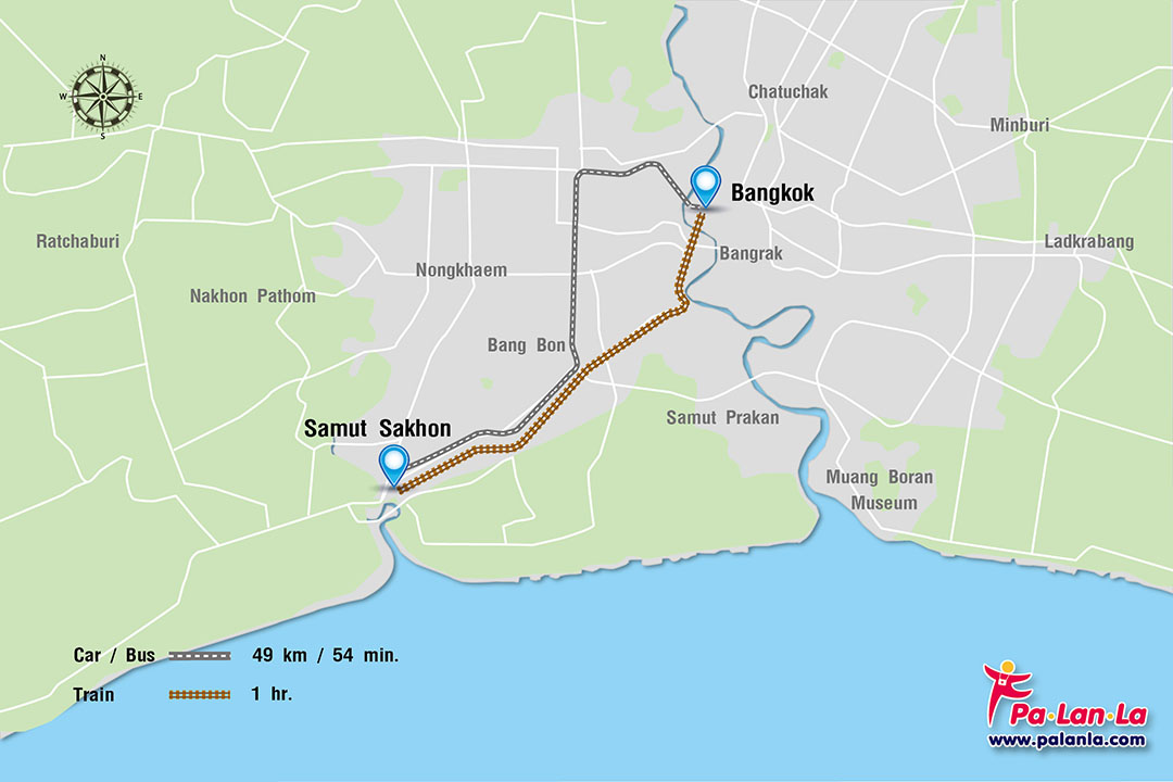 - รถไฟ (Train) การเดินทางโดยรถไฟจากกรุงเทพฯ ไปจังหวัดสมุทรสาคร ใช้เวลาประมาณ 1 ชั่วโมง