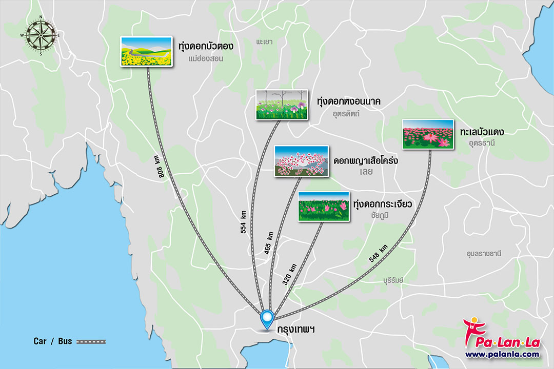 แผนที่แสดงตำแหน่งของทุ่งดอกไม้งามทั้ง 5 แห่งในประเทศไทย