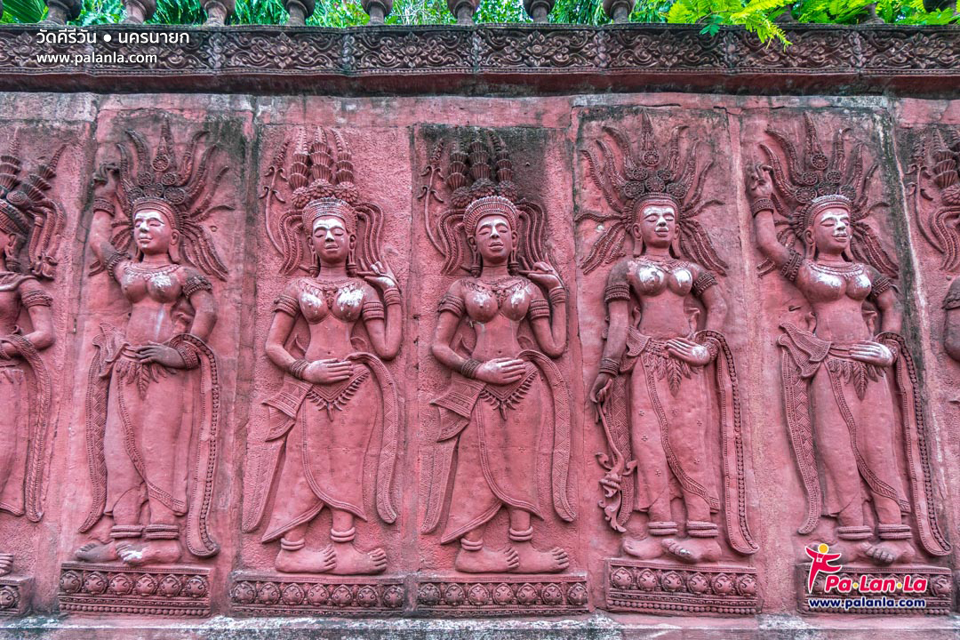 บริเวณกำแพงสลักลวดลวยเป็นรูปสตรีในชุดโบราณกำลังร่ายรำ