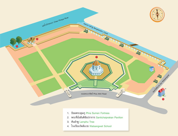 แผนผังภายในบริเวณสวนสันติชัยปราการ ขอบคุณภาพประกอบจาก https://rattanakosinislandguide.wordpress.com