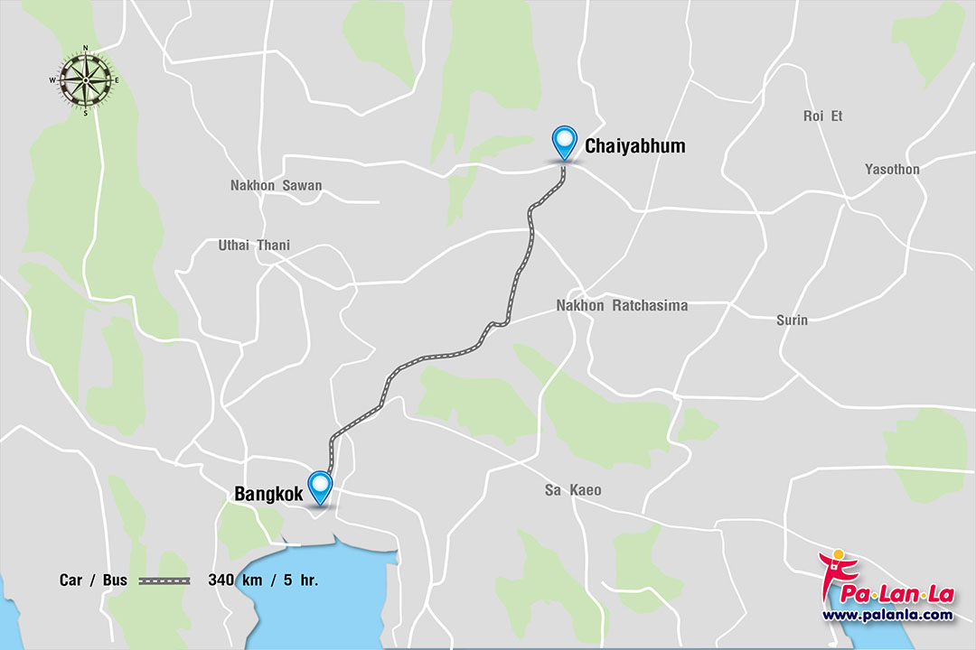 - รถยนต์ (Car / Bus) การเดินทางโดยรถยนต์จากกรุงเทพฯ ไปจังหวัดชัยภูมิ มีระยะทาง 340 กิโลเมตร ใช้เวลาเดินทางประมาณ 5 ชั่วโมง