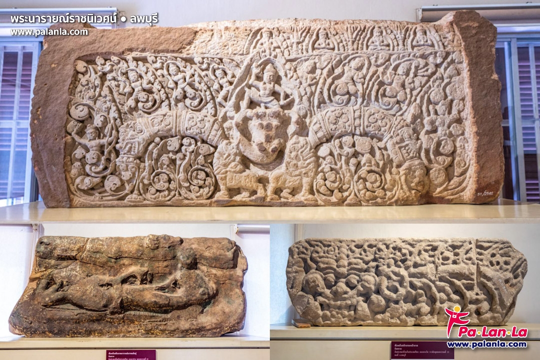 ทับหลังสลักภาพพระอินทร์ทรงช้างเอราวัณ (ภาพบน) ทับหลังสลักภาพนารายณ์บรรทมสินธุ์ (ภาพล่างซ้าย) และทับหลังสลักลายหน้ากาก (ภาพล่างขวา)