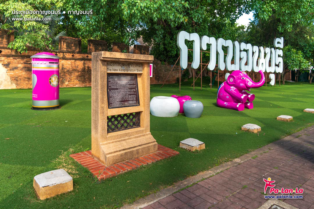 บริเวณมุมภ่ายภาพใกล้กับกำแพงเมืองเก่าที่ได้รับการตกแต่งด้วยรูปปั้นช้างและป้ายชื่อเมืองกาญจนบุรี