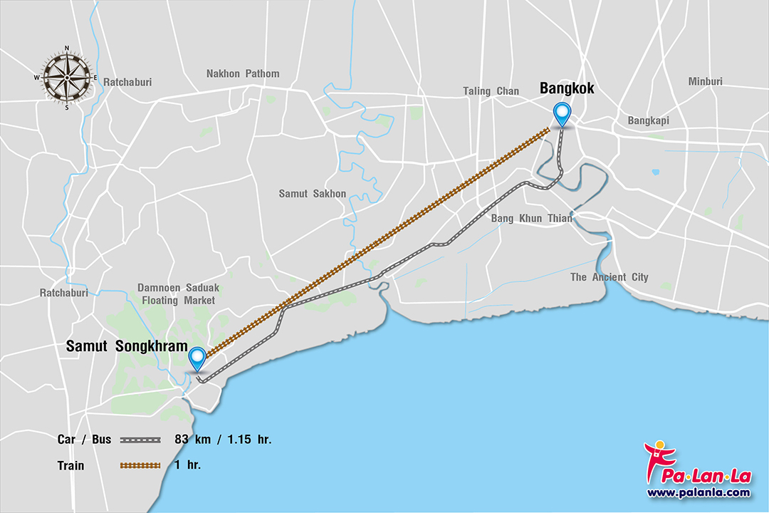 - รถยนต์ (Car) จากกรุงเทพมหานครไปจังหวัดสมุทรสงคราม มีระยะทาง 83 กิโลเมตร ใช้เวลาเดินทางประมาณ 1 ชั่วโมง 15 นาที