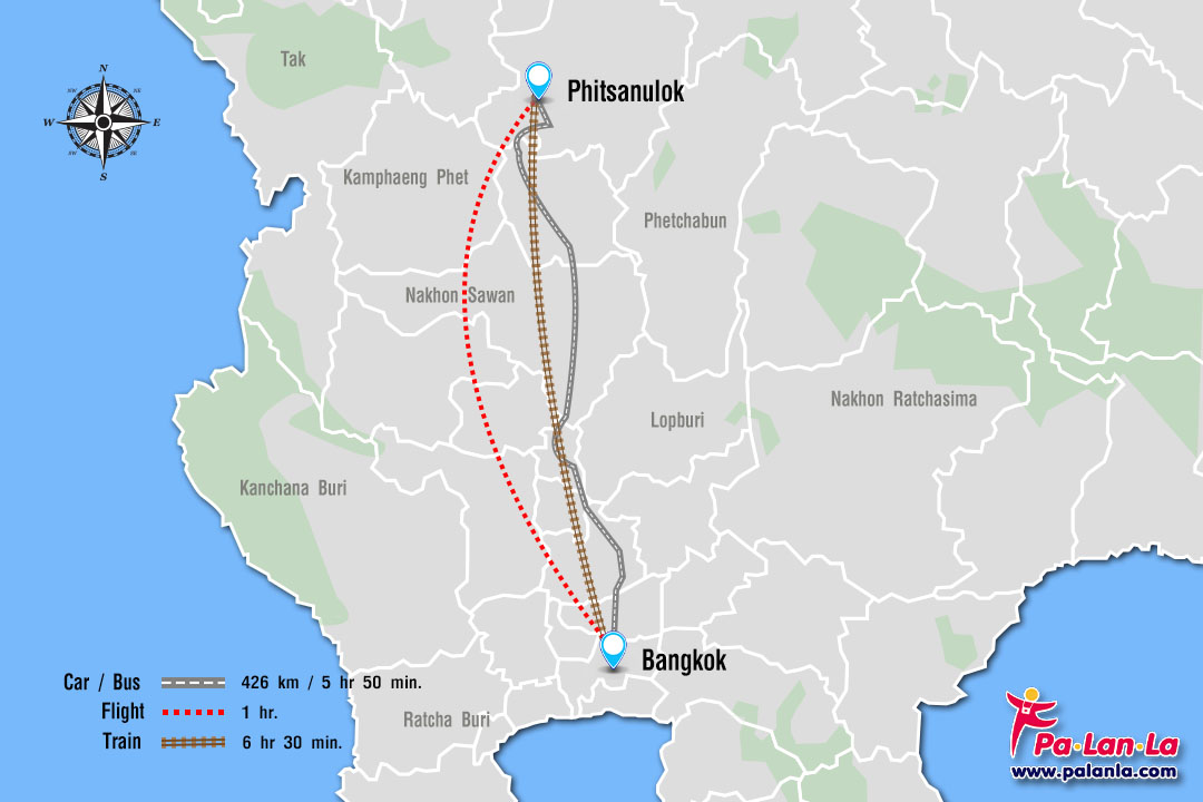 - เครื่องบิน (Flight) จากกรุงเทพขึ้นเครื่องที่สนามบินดอนเมืองหรือสนามบินสุวรรณภูมิ และลงเครื่องที่สนามบินพิษณุโลก ใช้เวลาเดินทางประมาณ 1 ชั่วโมง