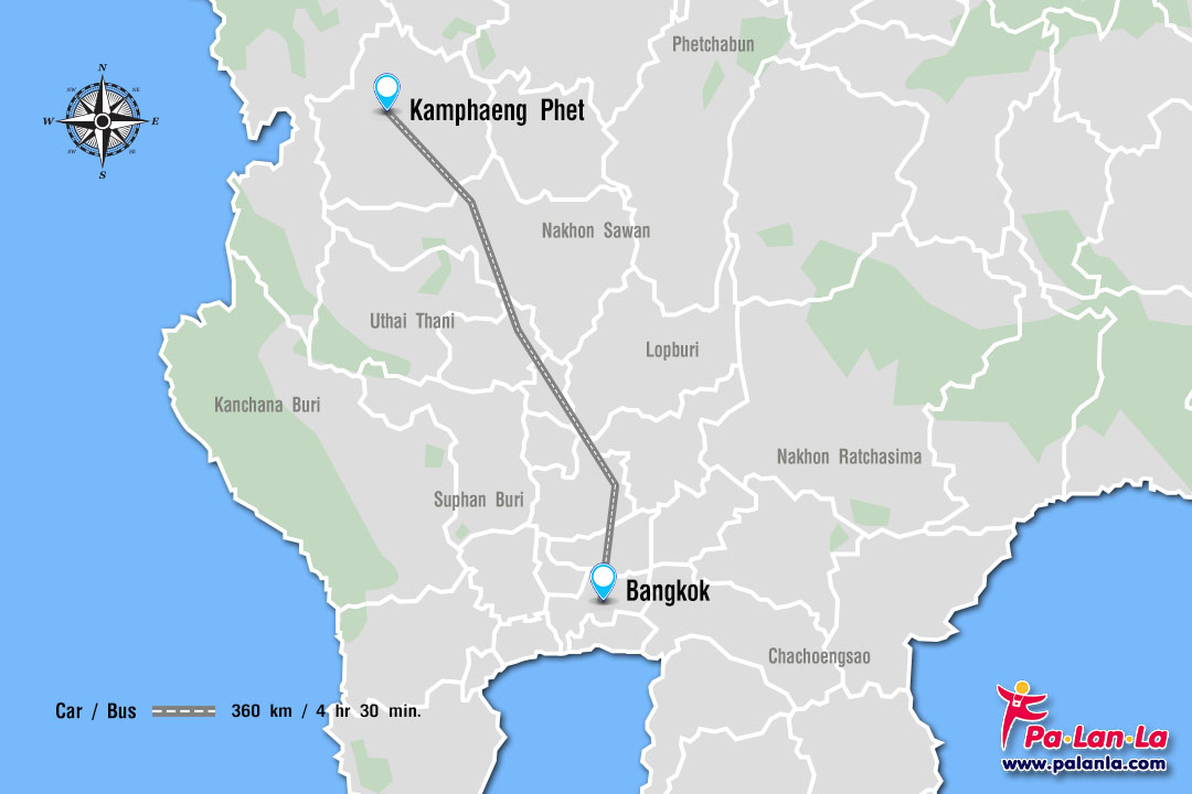 - รถยนต์ (Car) จากกรุงเทพไปยังจังหวัดกำแพงเพชรโดยรถยนต์มีระยะทางประมาณ 360 กิโลเมตร ใช้เวลาเดินทางประมาณ 4 ชั่วโมง 30 นาที