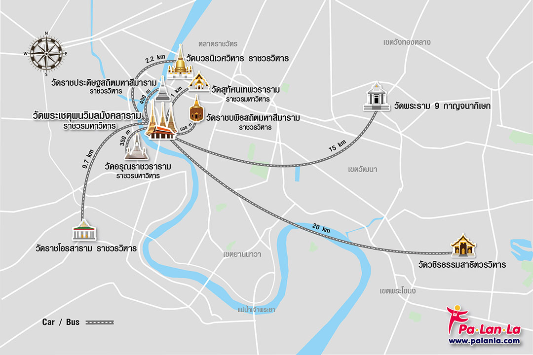 แผนที่แสดงตำแห่งของ 9 วัดคู่บ้านคู่เมืองราชวงศ์จักรี