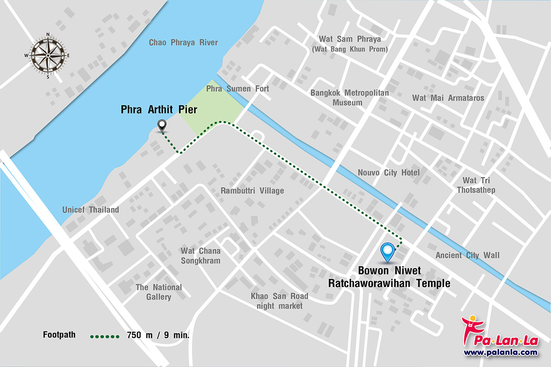 - เรือ นักท่องเที่ยวสามารถเดินทางโดยเรือ จากท่าพระอาทิตย์ เดินมาวัดบวรนิเวศวิหาร ราชวรวิหารระยะทางประมาณ 750 เมตร ใช้เวลาประมาณ 9 นาที