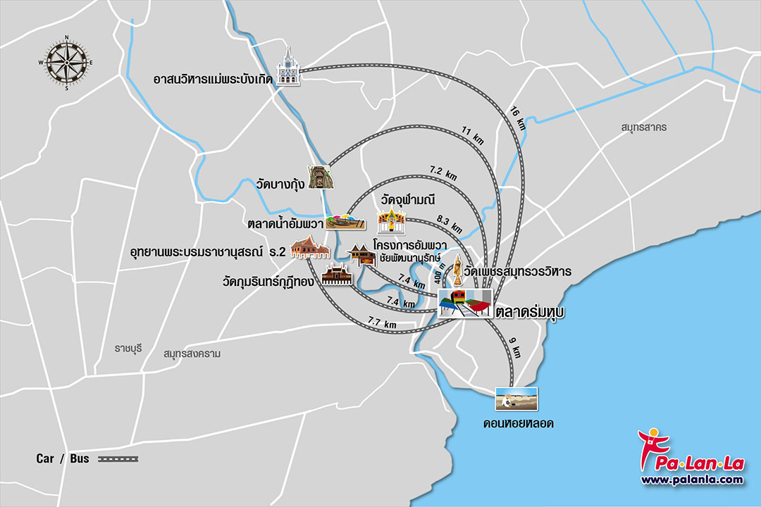 แผนที่แสดงตำแหน่งของ 10 สถานที่เที่ยวยอดนิยมในสมุทรสงคราม