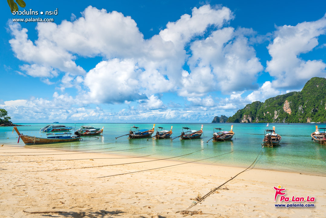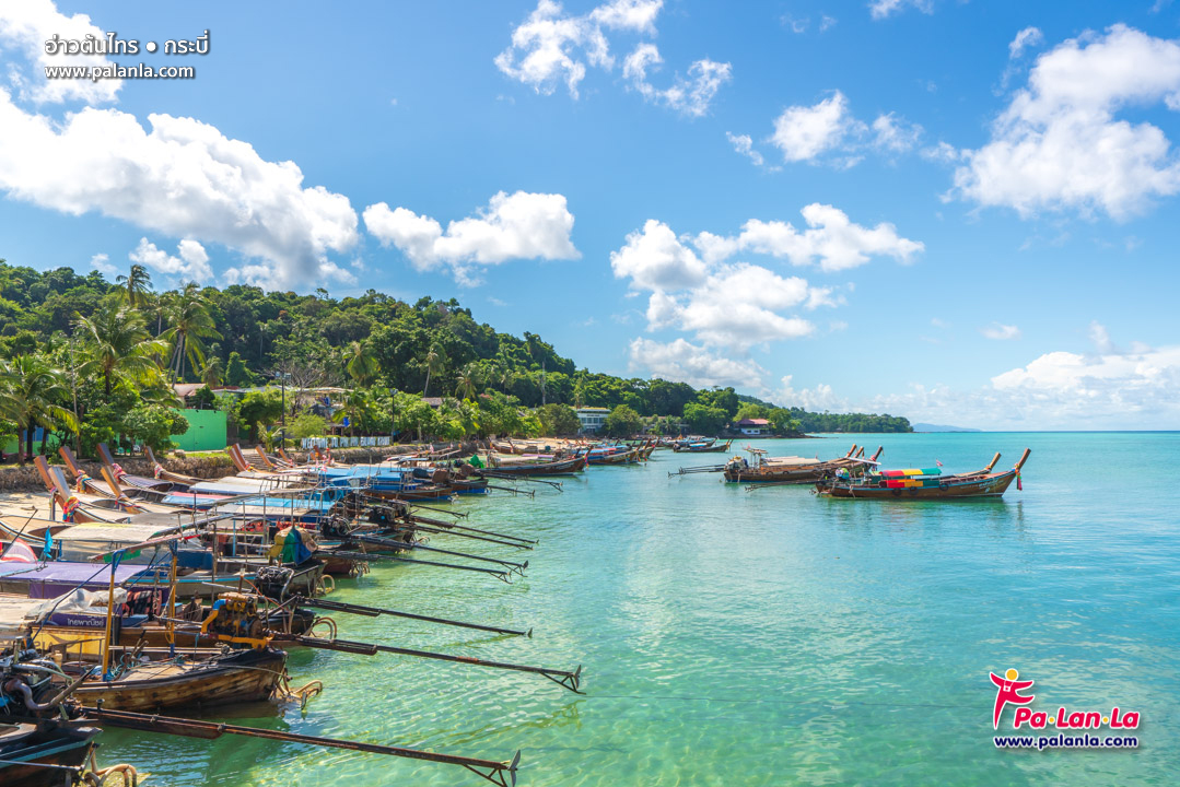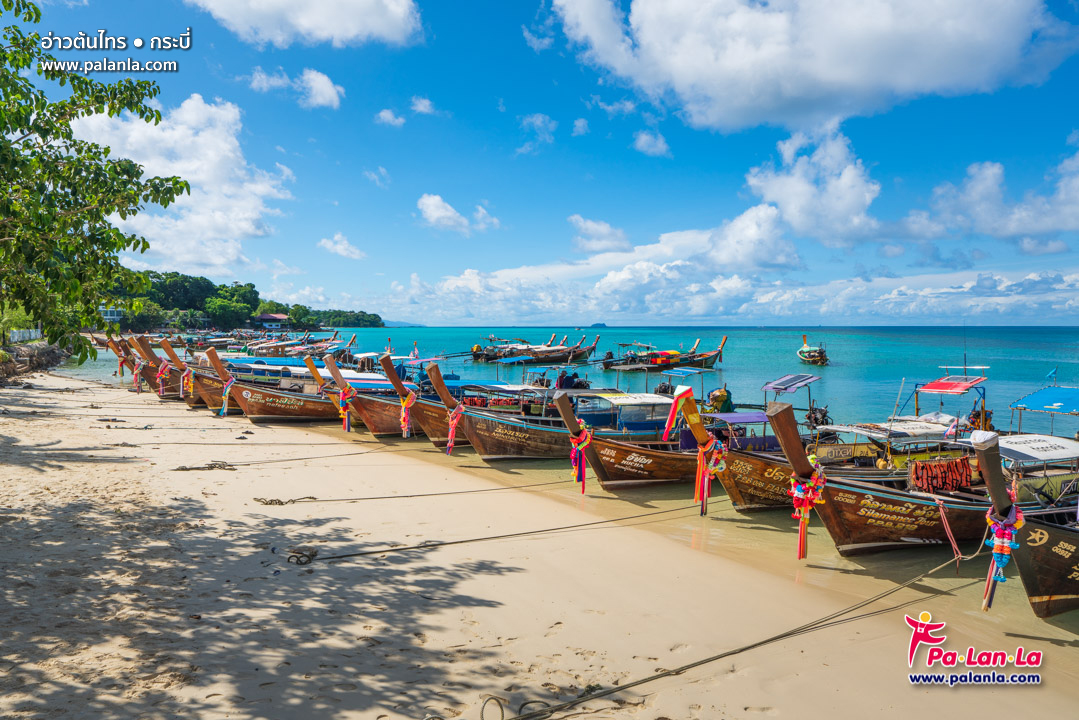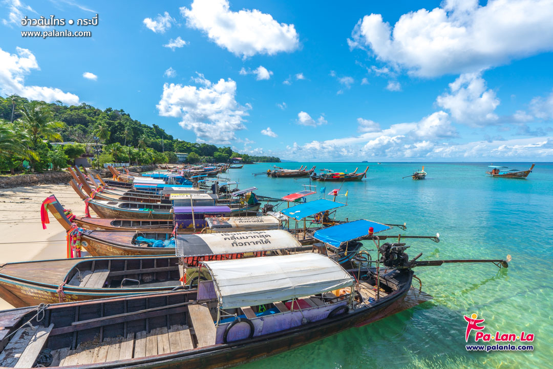 เรือหางยาวจอดเรียงรายอยู่ริมชายหาดบริเวณอ่าวต้นไทร