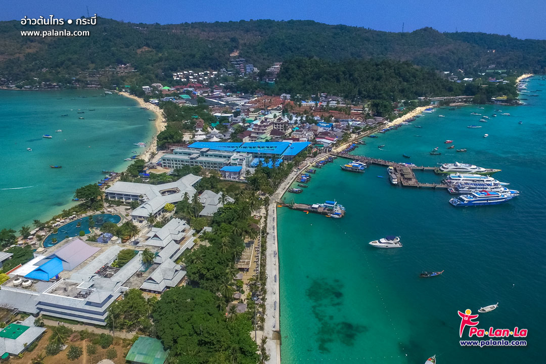 ทางฝั่งขวาของภาพคืออ่าวต้นไทรซึ่งเป็นที่ตั้งของท่าเรือหลักของเกาะพีพีดอนและมีถนนเลียบชายหาด