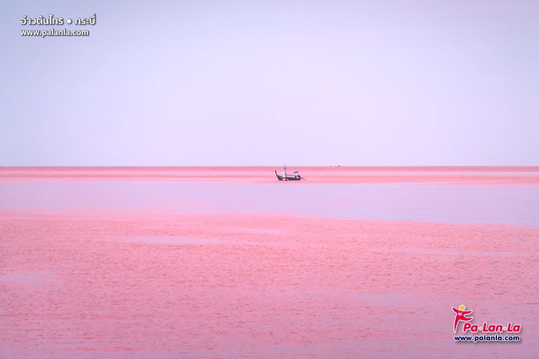 เรือหางยาวกลางท้องทะเลที่สะท้อนสีชมพูอมแดงในช่วงพระอาทิตย์ตกดิน