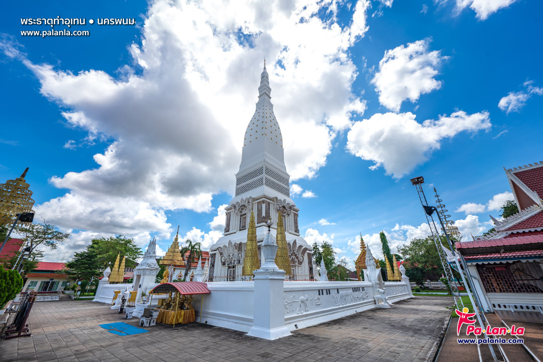 พระธาตุท่าอุเทนเป็นพระธาตุองค์สีขาวสลักลวดลายอย่างงดงาม