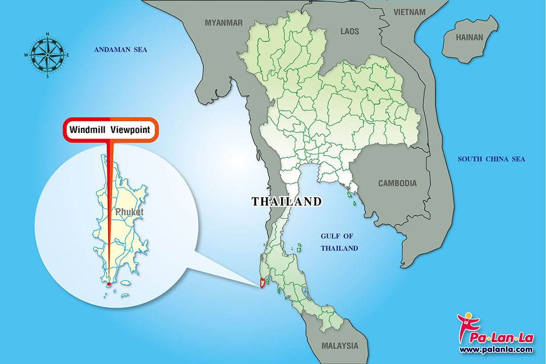 จุดชมวิวกังหันลม ตั้งอยู่ที่ ตำบลราไวย์ อำเภอเมือง ห่างจากตัวเมืองภูเก็ต 18 กิโลเมตร ใช้เวลาเดินทางโดยรถยนต์ประมาณ 33 นาที