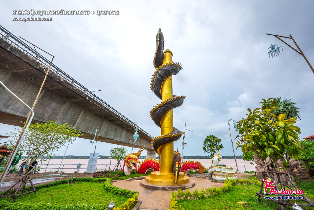 รูปปั้นพญานาคอนันตนาคราชเลื้อยพันรอบเสาสีทอง หันพระเศียรไปทางแม่น้ำโขง