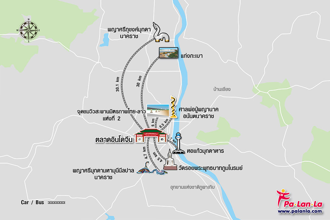 การเดินทาง : จากตลาดอินโดจีนไปยังพญาศรีภุชงค์มุกดานาคราช มีระยะทางประมาณ 30.1 กิโลเมตร ใช้เวลาเดินทางประมาณ 20 นาที