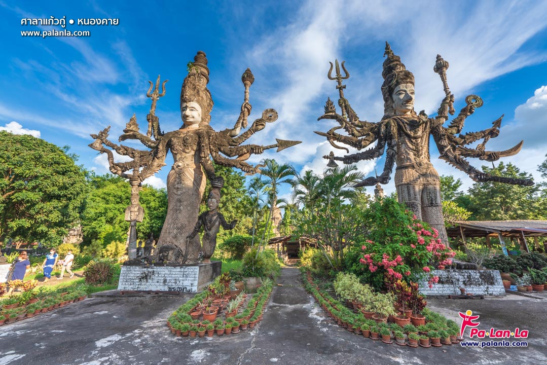 ศาลาแก้วกู่เป็นอุทยานเทวาลัยของสำนักปฏิบัติธรรมแก้วกู่ ตั้งอยู่ภายในอำเภอเมืองหนองคาย บนเนื้อที่ 42 ไร่ ภายในเป็นที่ประดิษฐานรูปปั้นคอนกรีตเสริมเหล็กขนาดมหึมาจำนวนกว่า 200 องค์ โดยมีทั้งพระพุทธรูป เทวรูปพระโพธิสัตว์ เทพเจ้าฮินดู บุคคลสำคัญในคริสตศาสนา และตัวละครจากเรื่องรามเกียรติ์ โดยบริเวณฐานของพระรูปแต่ละองค์จะมีคำอธิบายและแนวคิดของผลงาน รวมถึงคติเตือนใจเป็นภาษาอีสานและภาษาไทยกำกับเอาไว้เพื่อให้ผู้ที่มาเที่ยวชมได้ศึกษาและทำความเข้าใจ
