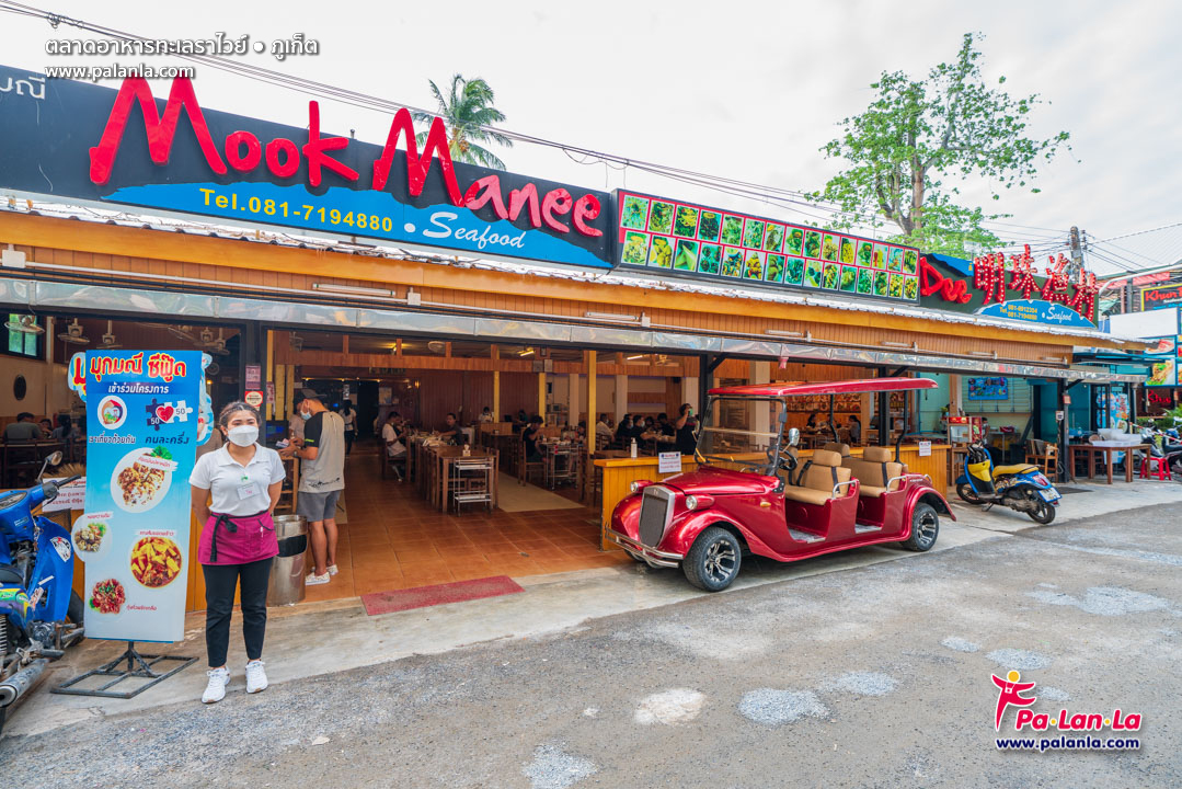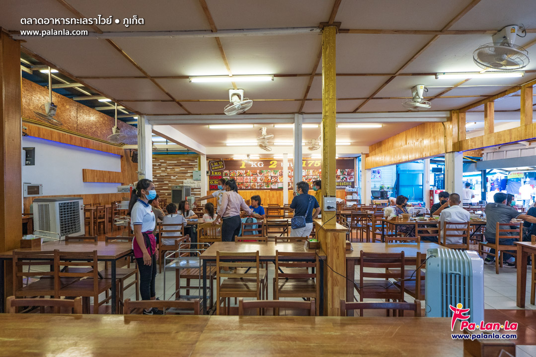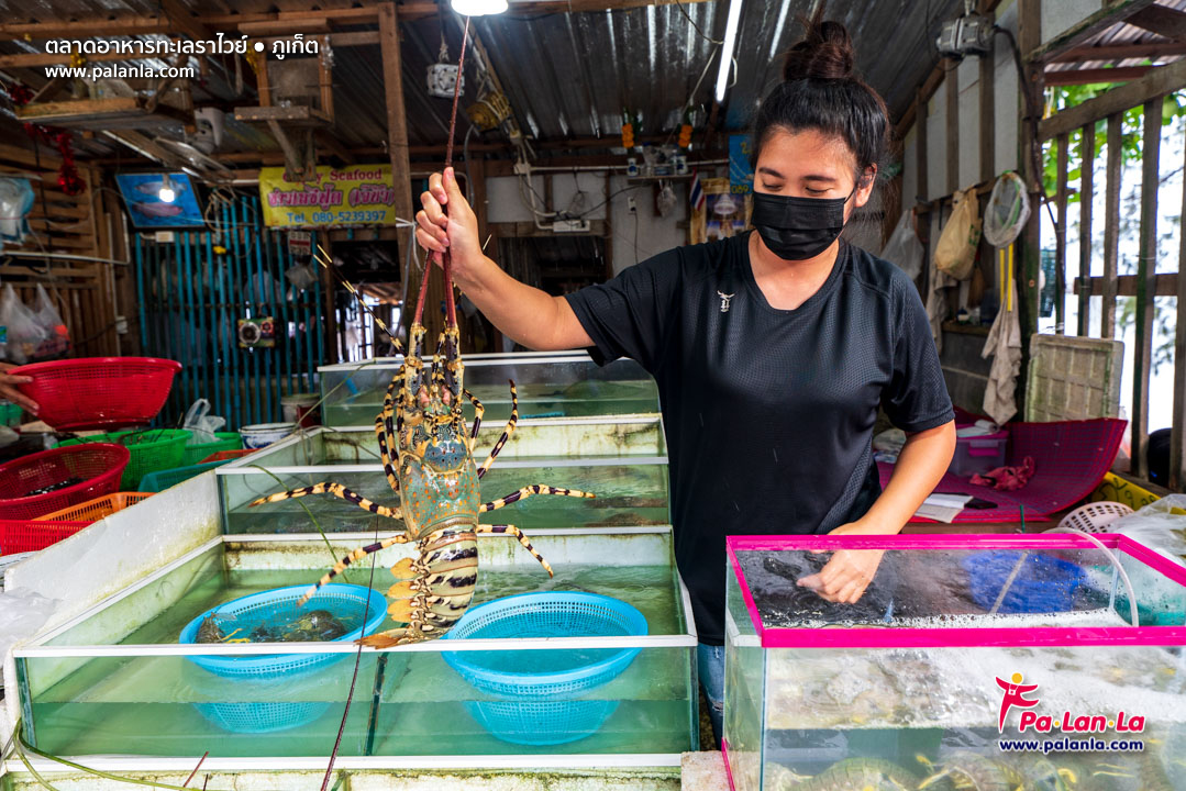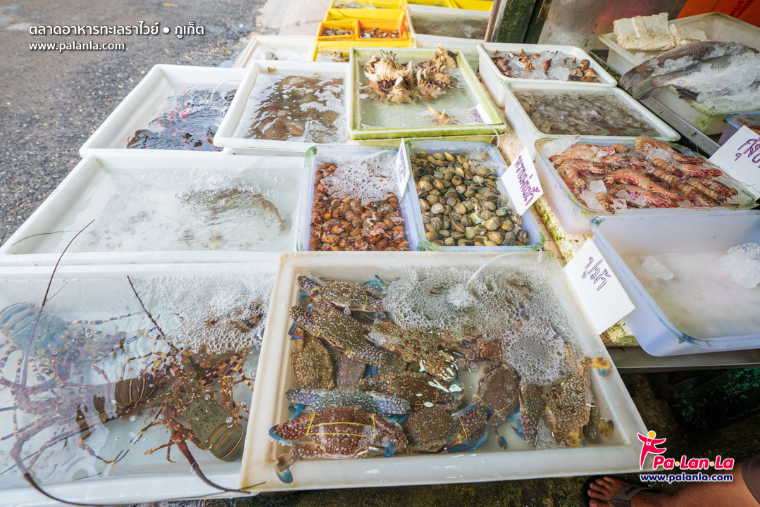 ที่ตลาดอาหารทะเลราไวย์ ฝั่งหนึ่งจะเป็นร้านอาหารเรียงราย อีกฝั่งหนึ่งเป็นแผงขายอาหารทะเลสดๆ