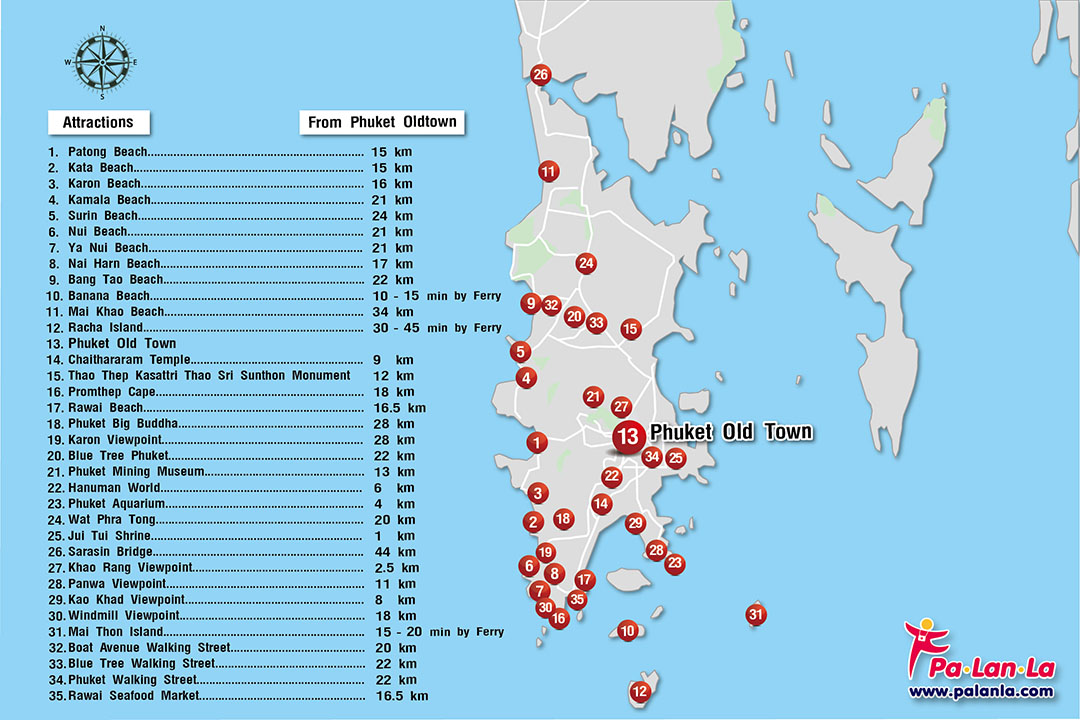 แผนที่แสดงตำแหน่งของ 35 สถานที่เที่ยวยอดนิยมในภูเก็ต