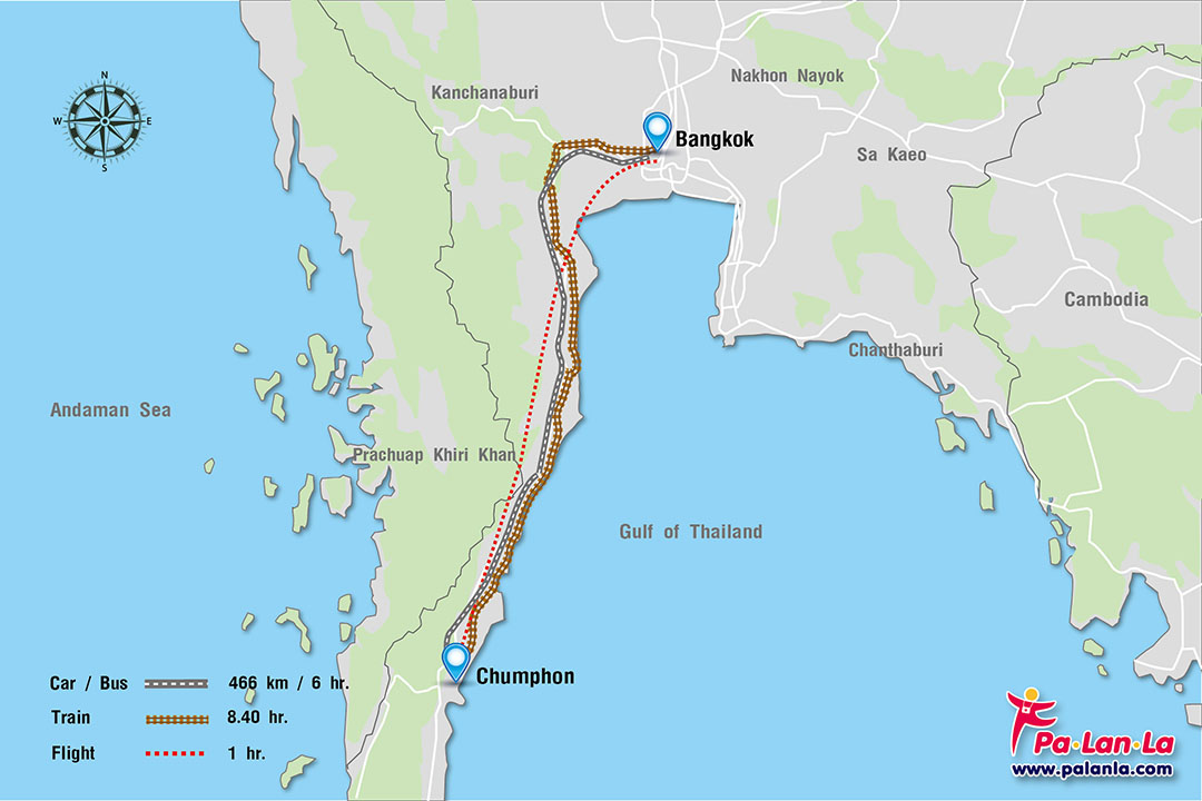 - รถไฟ (Train) การเดินทางโดยรถไฟจากกรุงเทพฯ ไปจังหวัดชุมพร ใช้เวลาเดินทางประมาณ 8 ชั่วโมง 40 นาที