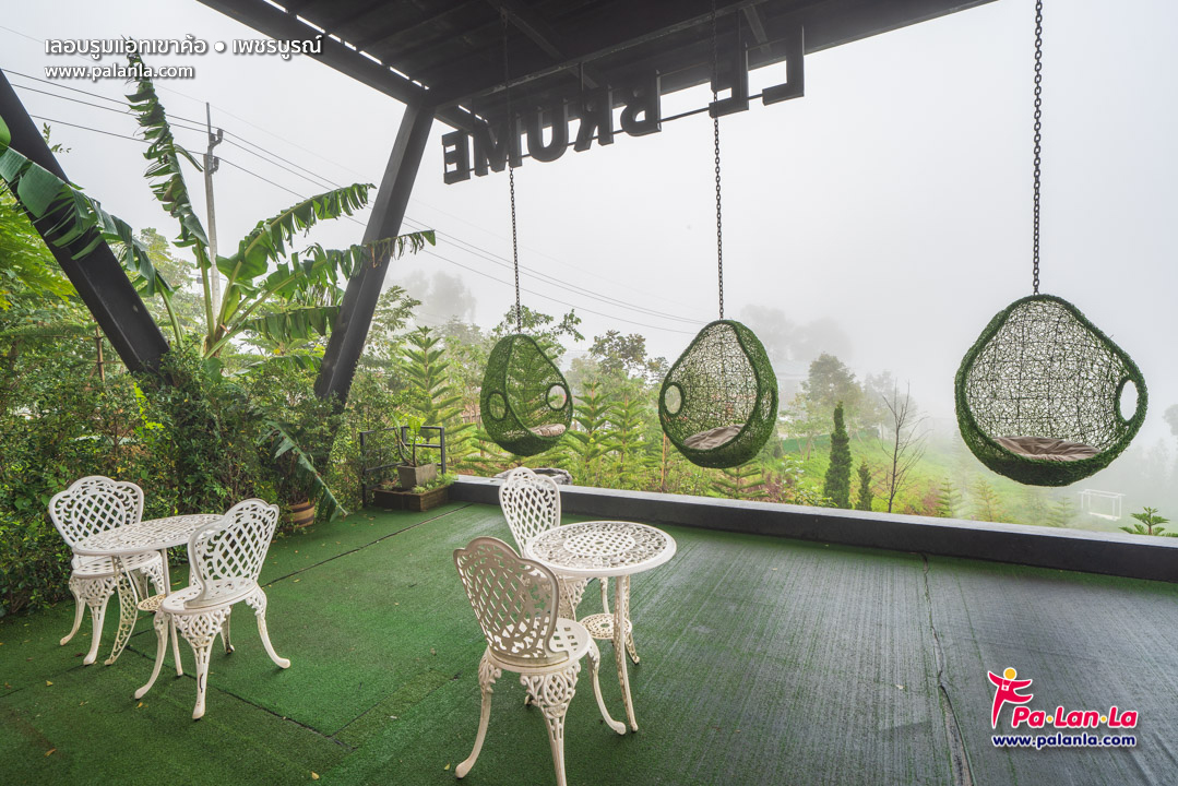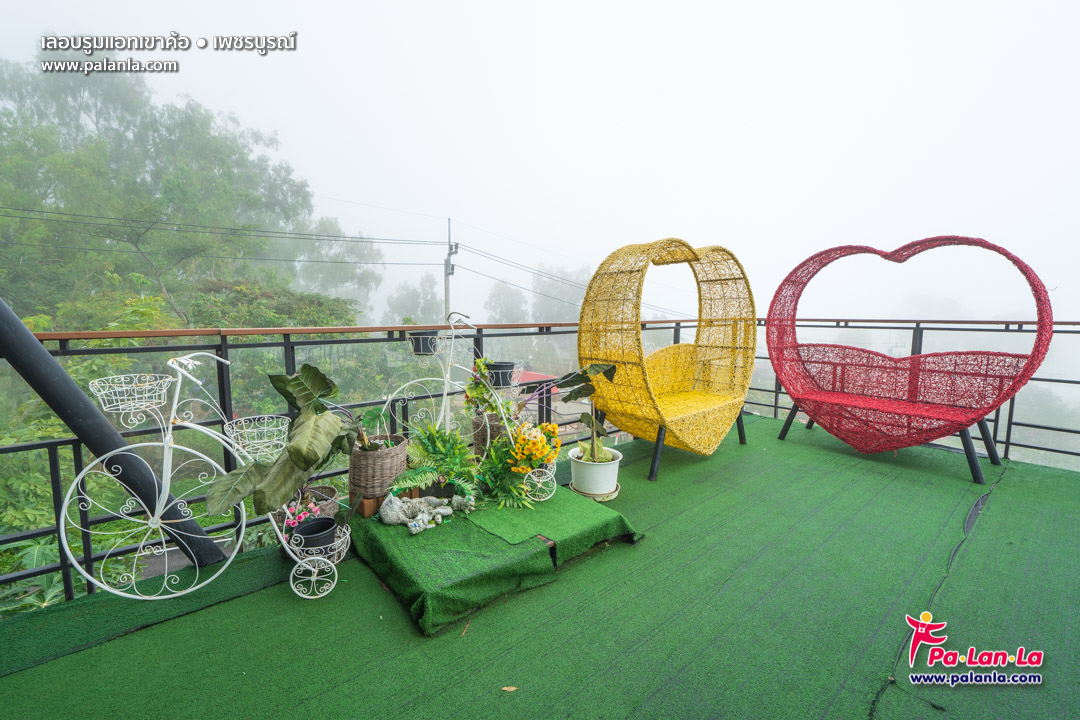 บริเวณที่นั่งโซนด้านนอกร้านสำหรับนั่งชมทิวทัศน์และสายหมอก
