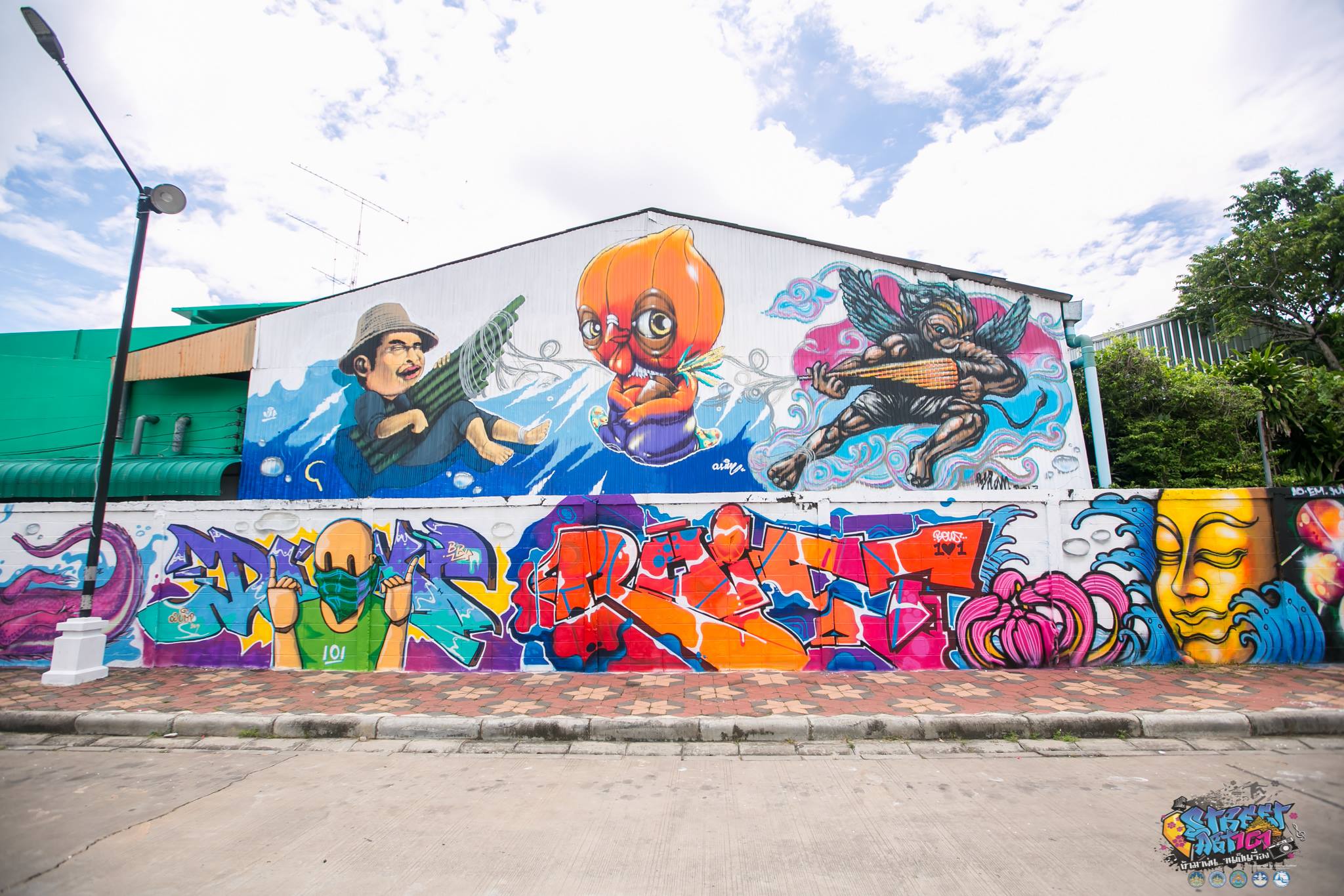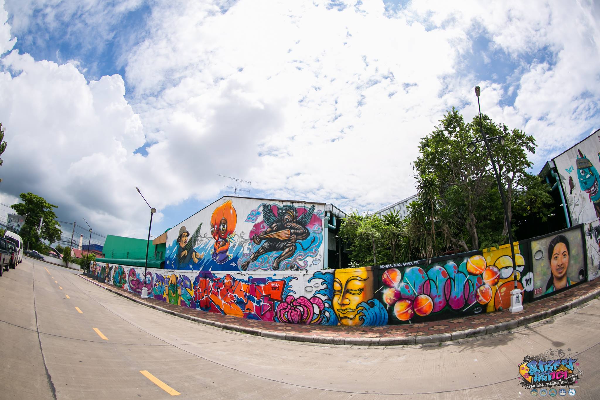 ผลงานบางส่วนบนผนังกำแพงที่สตรีทอาร์ต ร้อยเอ็ด (ขอบคุณภาพประกอบจาก https://www.facebook.com/StreetArtRoiEt)