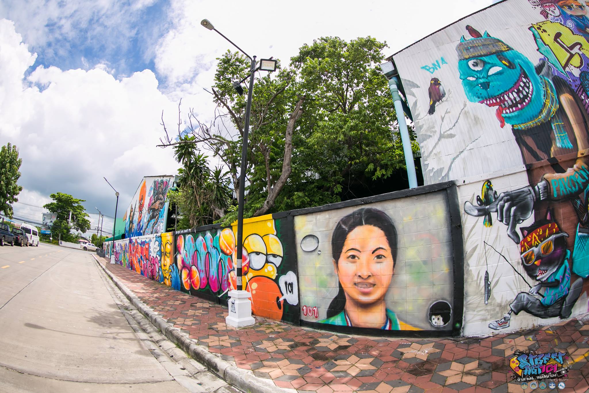 สตรีทอาร์ต ร้อยเอ็ด เป็นสตรีทอาร์ตบนกำแพงที่ยาวที่สุดในภาคอีสาน (ขอบคุณภาพประกอบจาก https://www.facebook.com/StreetArtRoiEt)