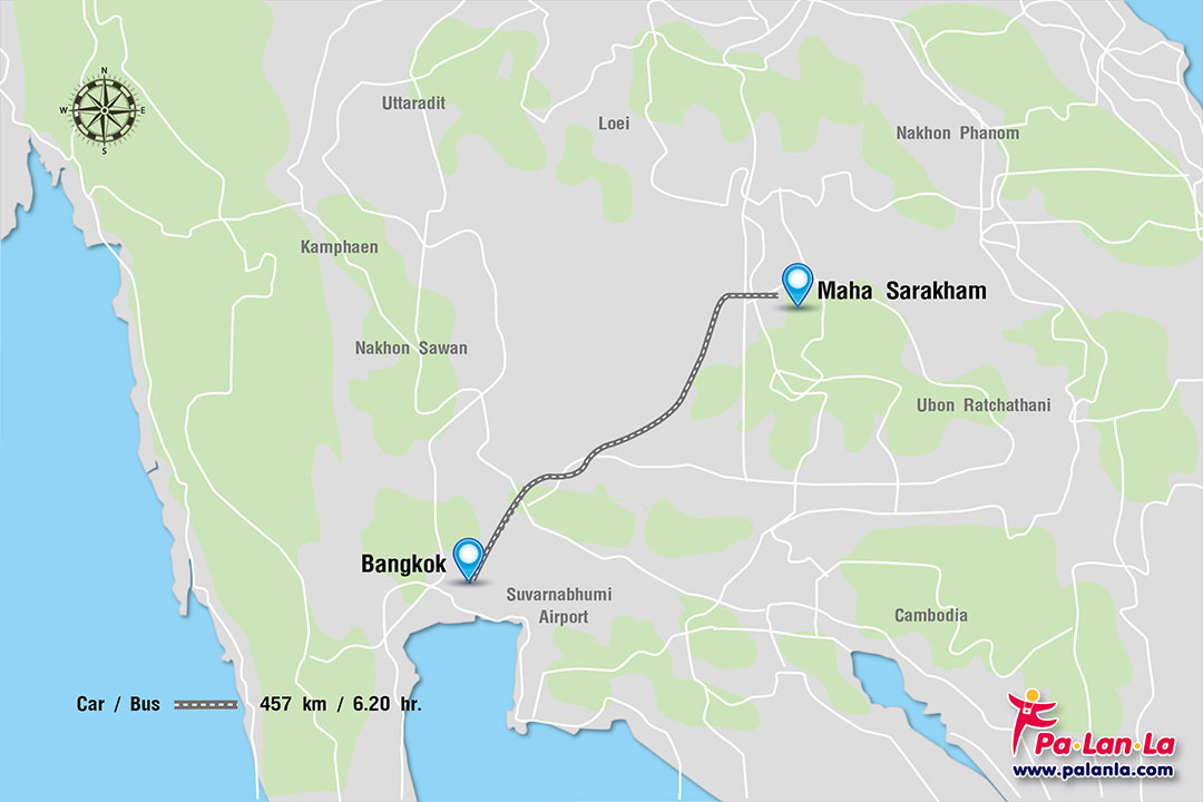 - รถยนต์ (Car/ Bus) การเดินทางโดยรถยนต์จากกรุงเทพฯ ไปจังหวัดมหาสารคาม มีระยะทาง 457 กิโลเมตร ใช้เวลาเดินทางประมาณ 6 ชั่วโมง 20 นาที