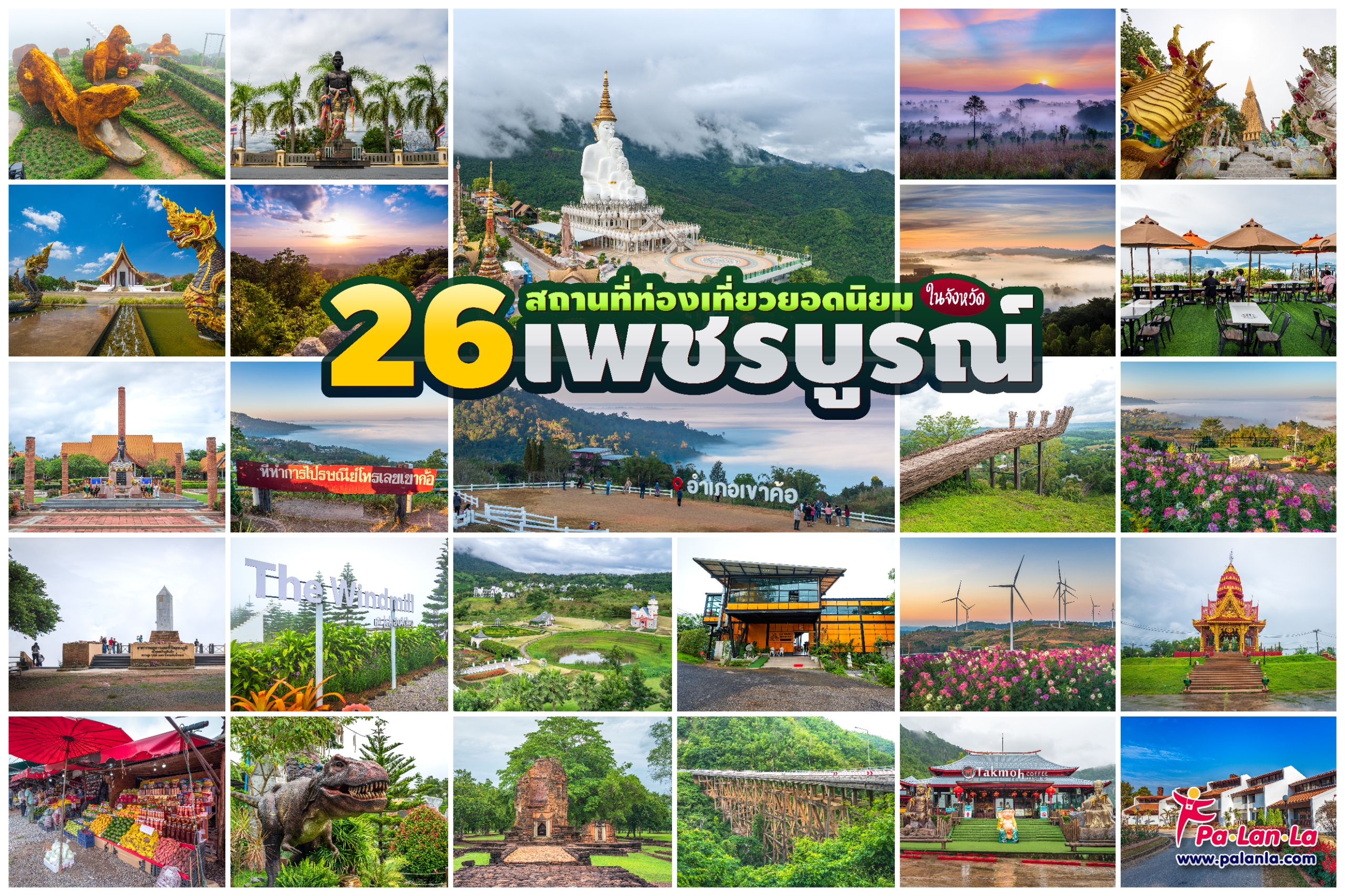 จังหวัดเพชรบูรณ์เป็นจังหวัดที่อยู่บริเวณภาคเหนือตอนล่างและภาคกลางตอนบน มีสภาพภูมิประเทศเป็นที่ราบสูงท่ามกลางภูเขาสลับซับซ้อนและมีสภาพอากาศเย็นเกือบตลอดทั้งปีจึงเป็นที่ถูกอกถูกใจของนักท่องเที่ยวที่ชื่นชอบธรรมชาติ เพราะสถานที่ท่องเที่ยวหลักๆ ของจังหวัดเพชรบูรณ์จะเป็นสถานที่ท่องเที่ยวทางธรรมชาติทั้งภายในอุทยานแห่งชาติและบนยอดเขาต่างๆ โดยเฉพาะเขาค้อและภูทับเบิกที่มีจุดชมวิวทะเลหมอกอันสวยงามน่าประทับใจเป็นอย่างมาก นอกจากนี้ จังหวัดเพชรบูรณ์ยังมีสถานท่องเที่ยวเชิงประวัติศาสตร์อีกหลายแห่งให้เที่ยวชมศึกษา เช่น อุทยานประวัติศาสตร์ศรีเทพ และ อนุสรณ์สถานเมืองราด รวมถึงศาสนสถานอีกหลายแห่งโดยมีวัดพระธาตุผาซ่อนแก้วเป็นแลนด์มาร์กที่ยิ่งใหญ่ประจำจังหวัด โดยทาง Palanla ได้คัดสรรสถานที่ท่องเที่ยวยอดนิยมจำนวน 23 แห่งในจังหวัดเพชรบูรณ์มาฝากกันในทริปนี้