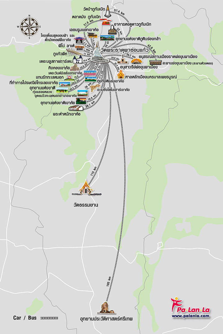 การเดินทาง : จากวัดพระธาตุผาซ่อนแก้วไปยังอนุสรณ์สถานเมืองราดพ่อขุนผาเมือง มีระยะทางประมาณ 39.2 กิโลเมตร ใช้เวลาเดินทางประมาณ 40 นาที