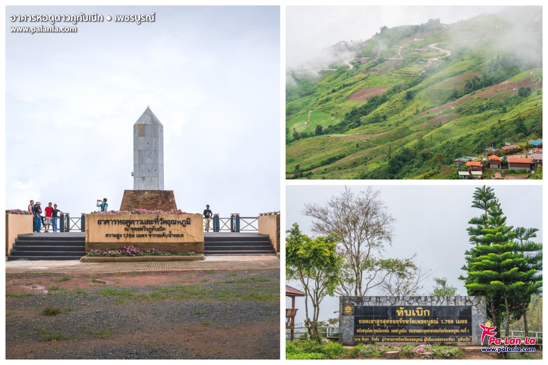 วัดป่าภูทับเบิกเป็นวัดที่อยู่บนเขา ซึ่งถือเป็นวัดที่ตั้งอยู่บนพื้นที่ที่สูงที่สุดในประเทศไทย มีบรรยากาศที่โอบล้อมด้วยป่าไม้ท่ามกลางทิวทัศน์เขาขุนเขาและสายหมอก ภายในวัดมีสิ่งปลูกสร้างที่งดงามมากมายไม่ว่าจะเป็นพระมหาธาตุเจดีย์โพธิปักขิยธรรมที่ตั้งตระหง่านอย่างยิ่งใหญ่อยู่ภายในวัด รวมถึงรูปปั้นทางพุทธศาสนาและพญานาคที่มีความงดงามเป็นอย่างมาก