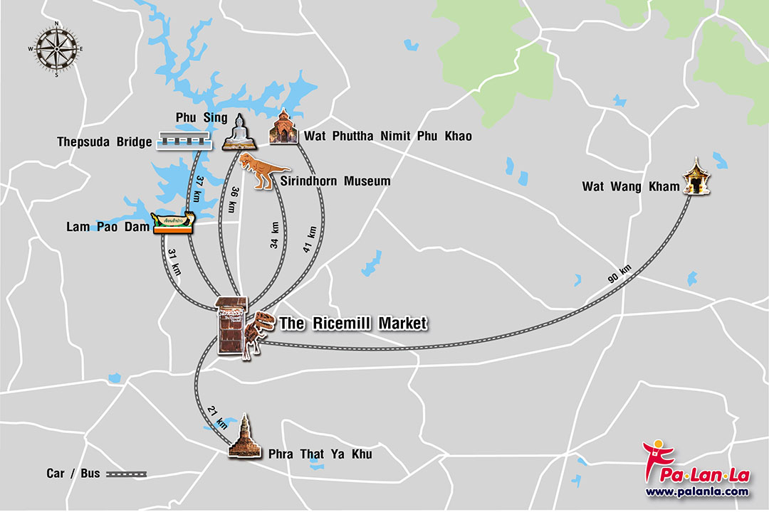 แผนที่แสดงตำแหน่ง 9 สถานที่เที่ยวยอดนิยมในจังหวัดร้อยเอ็ด