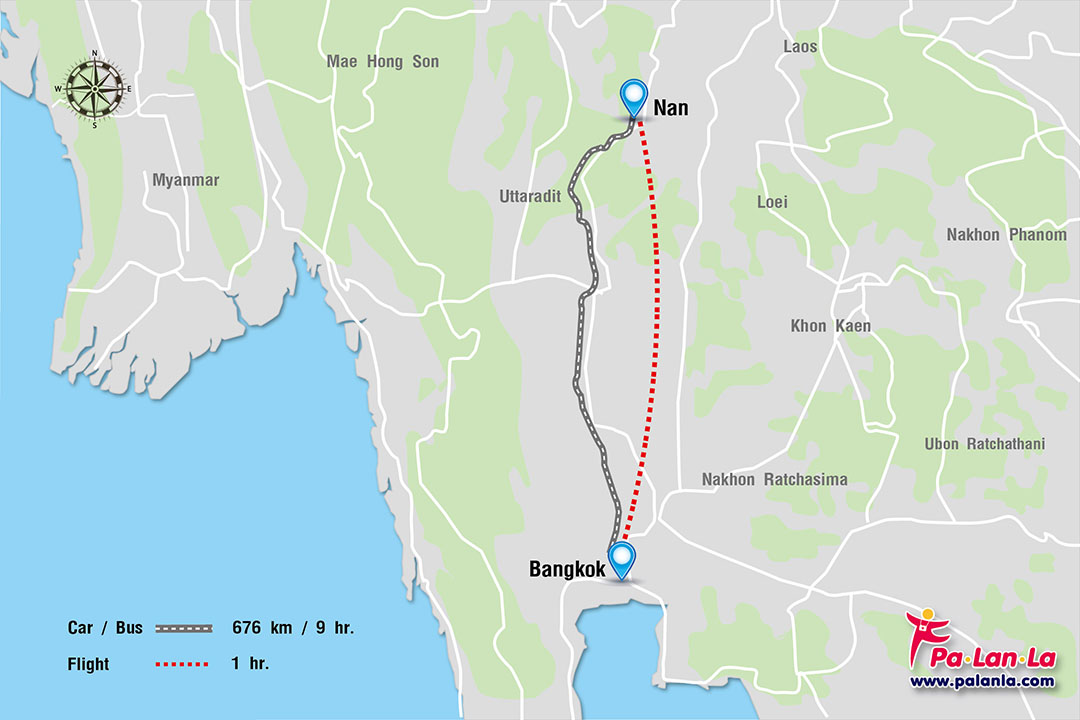 - เครื่องบิน (Flight) จากกรุงเทพขึ้นเครื่องบินที่สนามบินดอนเมืองหรือสนามบินสุวรรณภูมิ และลงเครื่องที่สนามบินน่าน ใช้เวลาเดินทางประมาณ 1 ชั่วโมง