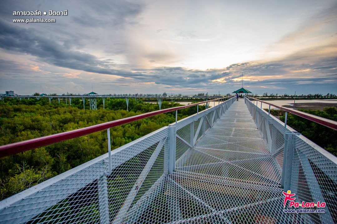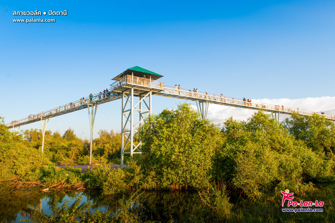ปัตตานี สกายวอล์ค เป็นเส้นทางเดินลอยฟ้าเหนือป่าชายเลนที่ตั้งอยู่ในสวนสมเด็จพระศรีนครินทร์ สวนเจ้าฟ้ากัลยาณิวัฒนา หรือสวนแม่ สวนลูก ตำบลรูสะมิแล อำเภอเมือง จังหวัดปัตตานี สกายวอล์คแห่งนี้เป็นทางเดินตาข่ายเหล็กโปร่งความยาว 400 เมตร สูงจากพื้นดินประมาณ 12 เมตร หรือสูงประมาณตึก 5 ชั้น ท่ามกลางทัศนียภาพสวยๆ ของวิวของผืนป่าชายเลนที่มีความสมบูรณ์สวยงามแบบ 360 องศา