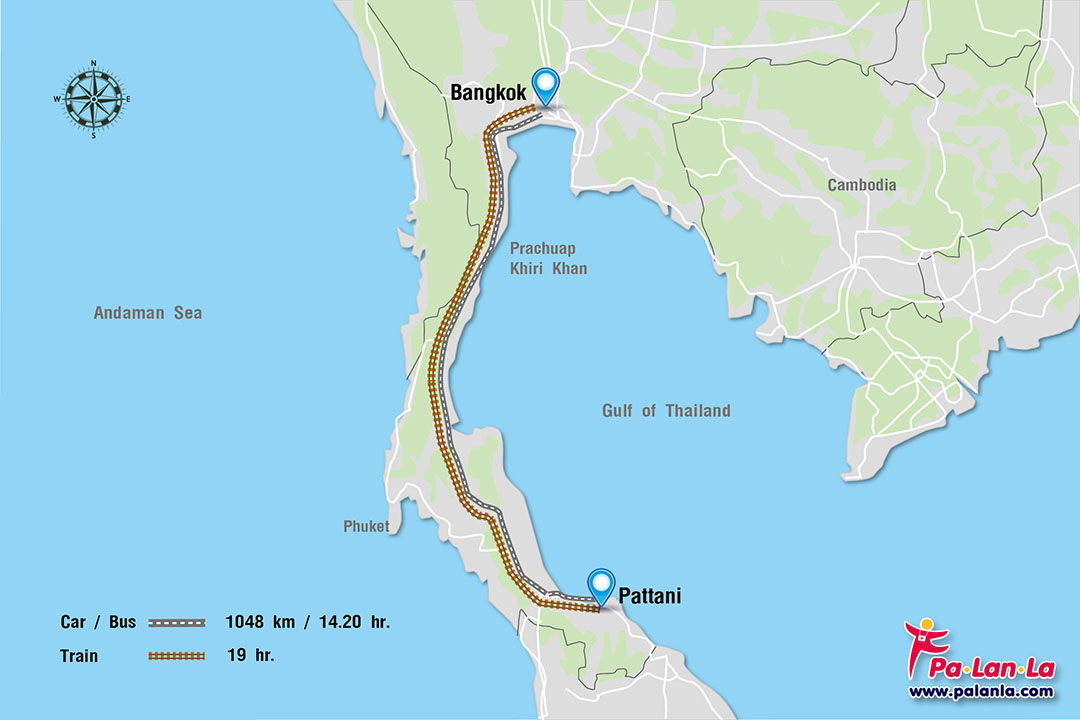 - รถยนต์ (Car/ Bus) การเดินทางโดยรถยนต์จากกรุงเทพฯ ไปจังหวัดปัตตานี มีระยะทาง 1048 กิโลเมตร ใช้เวลาเดินทางประมาณ 14 ชั่วโมง 20 นาที